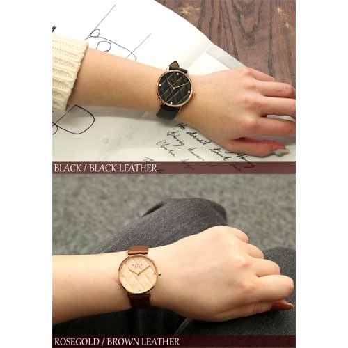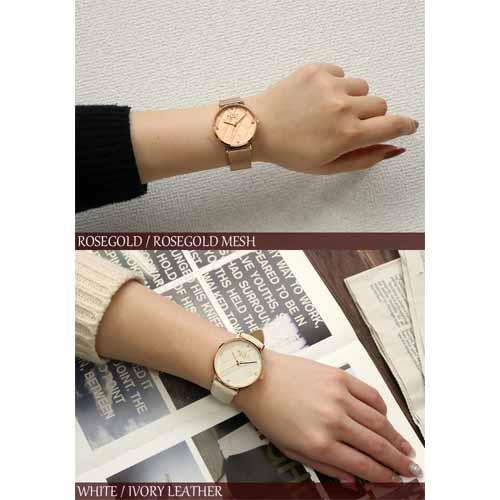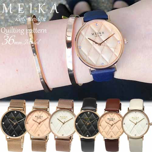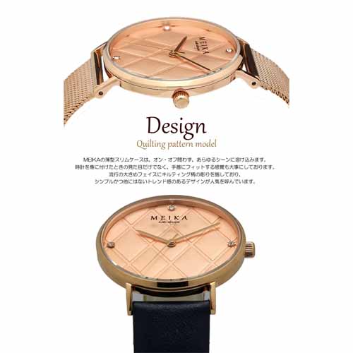 大きめのフェイスにキルティング柄の彫りを施していて、他にはないトレンド感のあるデザイン。ムーヴメントは日本製を採用し、 ケースは高品質なステンレスを使用。アクセサリー感覚で付けやすいことが魅力です。