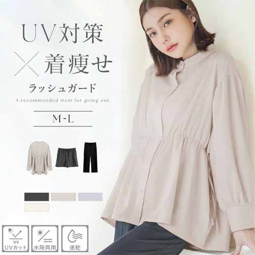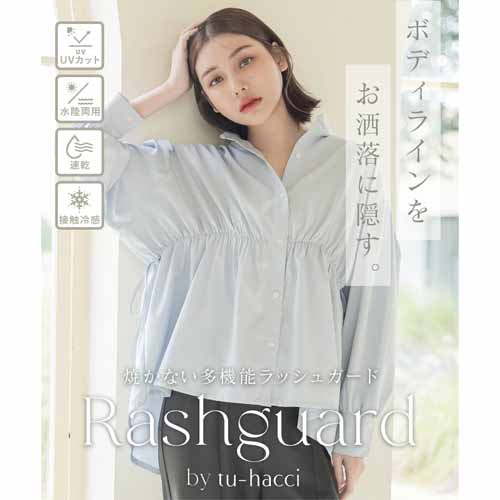 水陸両用で使えるフリルラッシュガードの上下セット。UVカット率は最大で99.5%のUPF50+最高ランクを評価されていて、ひんやり冷たい接触冷感が重宝します。速乾性もあって夏中まるごと使い倒せる、1万円以下のマストハブアイテムです。
