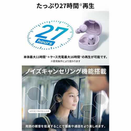 Bluetooth 5.3と高出力通信により、途切れにくく安定した再生を実現。マルチポイント対応&アクティブノイズキャンセリング機能により、オンオフを問わず活躍する完全ワイヤレスイヤホンです。ケース併用で約27時間の長時間再生が可能。片耳4.5g小型軽量ボディなので耳が疲れにくい設計が嬉しいポイントです。