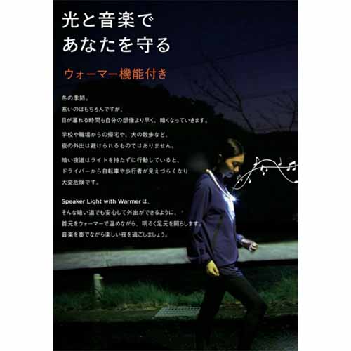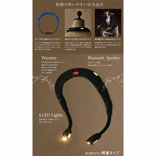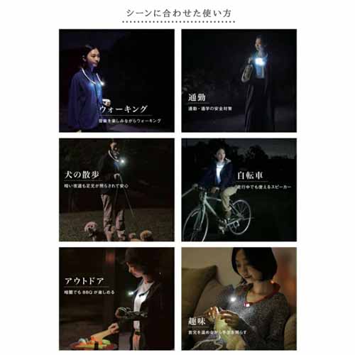 LEDライトとウォーマー機能が付いた便利なスピーカーライト。夜間の読書やアウトドアなど暗がりで手元を照らしたいシーンや、光で周囲に存在を知らせたいジョギング中にも役に立ちます。もちろん通話機能も付いていて、ハンズフリー通話ができます。