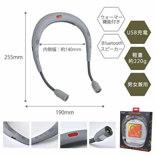 USB充電のタイプで、LEDライトだけなら約21時間、スピーカーだけなら約12時間の連続使用が可能です。首かけタイプで心配になる落下の懸念も、左右の先端が磁石でついて輪になるので安心です。