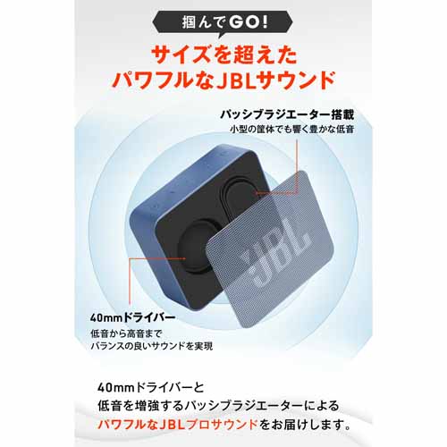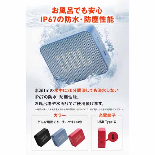 水深1mの水中に30分間浸しても浸水しないIP67の防水・防塵性能。重さ177gで手のひらサイズのコンパクトさを実現しながら、JBL品質のパワフルなサウンドが魅力です。最大5時間再生できるバッテリーを搭載しているので、長湯でも問題ありません。