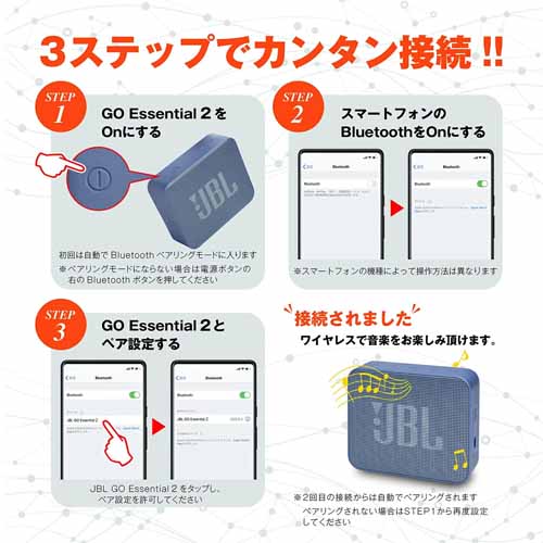 JBLの防水スピーカーは5000円以下でも手軽さが大きな魅力です。3ステップでペアリングが簡単で、2回目以降は自動でペアリング。スマホやタブレットなど、Bluetooth対応デバイスで音楽をワイヤレスにストリーミングできます。