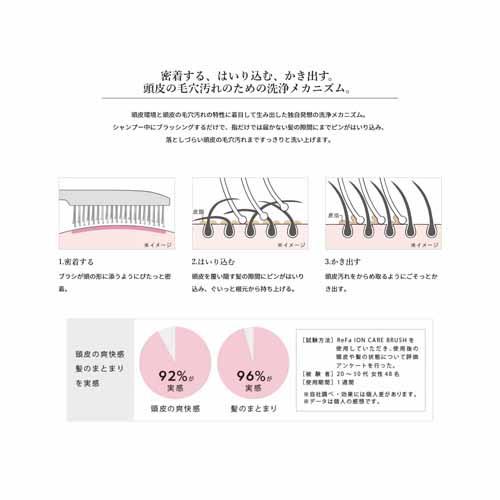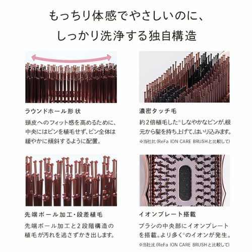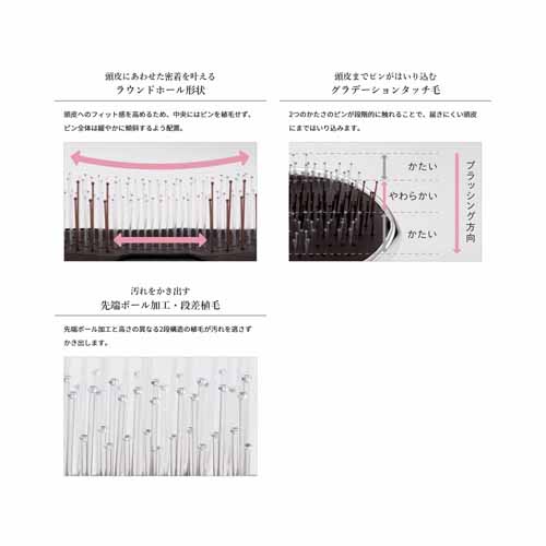 髪の汚れを落とすだけでなく、頭皮の毛穴をブラッシングする習慣を身につけられるシャンプーブラシ。頭皮に密着する形状とグラデーションタッチ毛で髪の隙間までピンが入り込み、先端ボール加工・段差植毛で落としづらい毛穴汚れまで洗い上げます。
