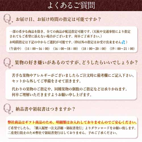 老舗の目利きによって厳選された旬の果物を詰め合わせ。甘さや熟度のバランスが良く、贈答用としての見映えも抜群です。化粧箱入りで、改まった快気祝いにも対応できます。