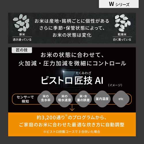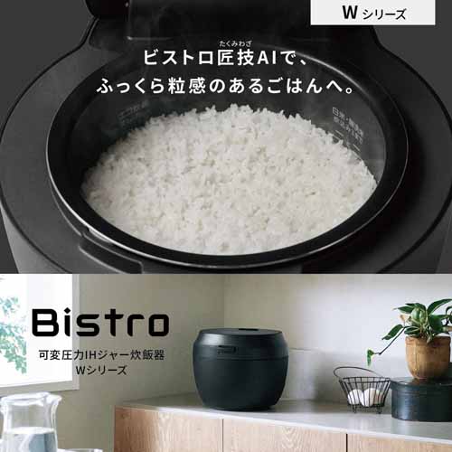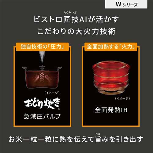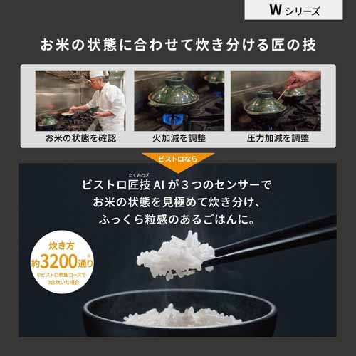 お米の状態を見極めるビストロ匠技AIが、お米の質や量にかかわらずふっくら粒感のあるご飯に炊き上げてくれます。独自技術のおどり炊きによる圧力と、全面発熱IHによる火力で、お米一粒一粒に熱を伝えて旨みをひきだします。