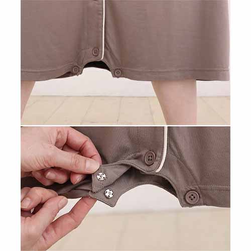 脇に縫い付けてあるベルトは結びやすく、胸元にスナップボタンも付いているので、授乳中のママにもおすすめです。子供をお風呂に入れた後のタオル代わりにもなり、バスタイムのひと仕事をサポートしてくれます。