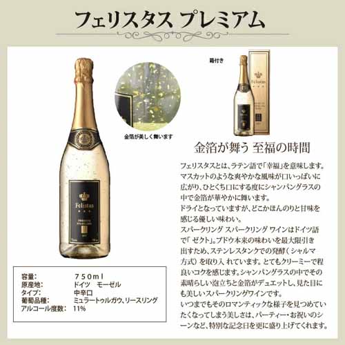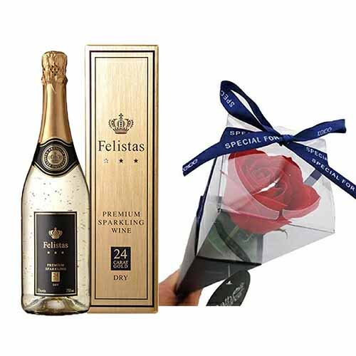 金箔入りスパークリングワイン「フェリスタス」と、花のカタチの入浴剤(ソープフラワー)「ケリーブーケ」のセット。スパークリングワインを舞う金箔がラグジュアリーな雰囲気を演出します。