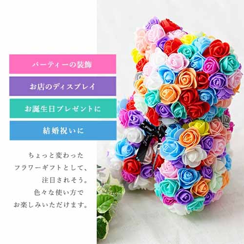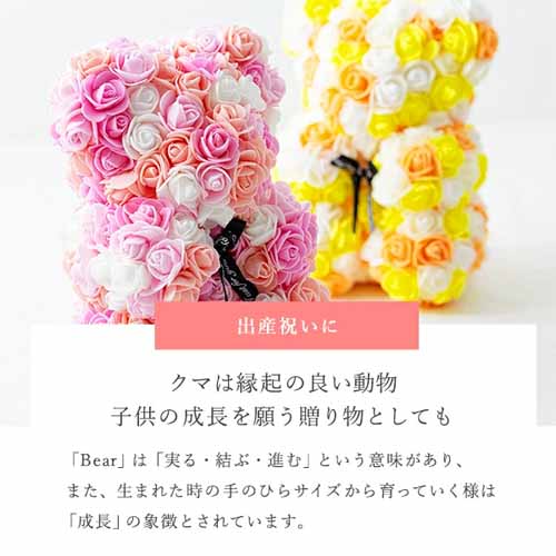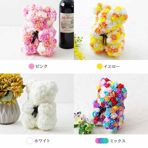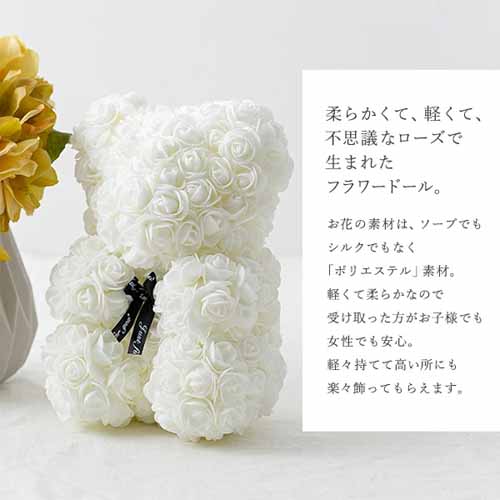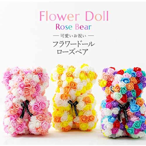 鮮やかな彩りとキュートなフォルムに癒されるフラワードール「ローズベア」。縦横15cm×高さ22cmのコンパクトなサイズ感ながらインパクトは抜群!ピンク・ホワイト・イエローなど4色が揃い、相手好みの色を選ぶことができます。
