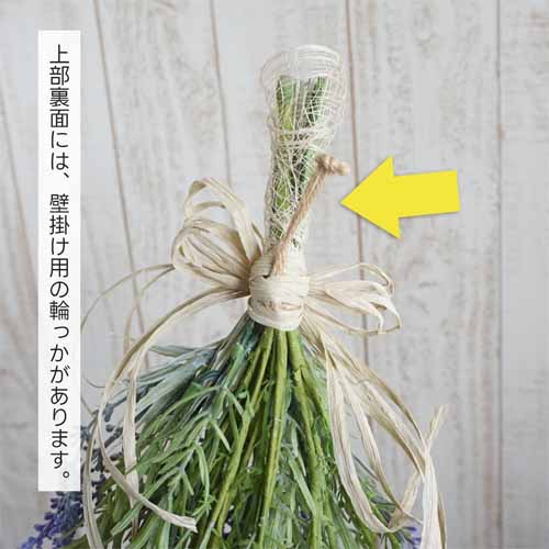 くすみカラーがおしゃれなアートフラワーのスワッグ。フロック加工を施したスモーキーな色味のラベンダーを使用し、野草風のグリーンと組み合わせて軽やかで優しいトーンに仕上げられています。