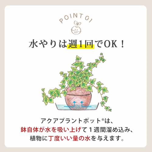 鉢自体が水を吸い上げて溜め込んでくれるので、水やりは週1回でOK。忙しい人でも管理がしやすく、植物を育てる楽しさを無理なく味わえます。サイズがコンパクトで置き場所を選ばず、棚やデスク上にもフィット。デザインもシンプルで、どんな部屋にも馴染みます。