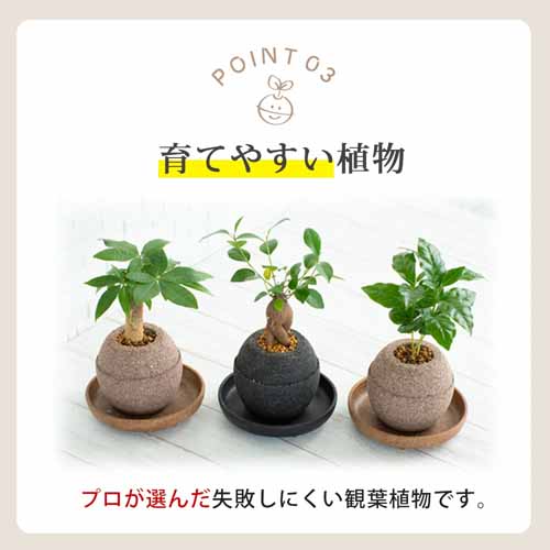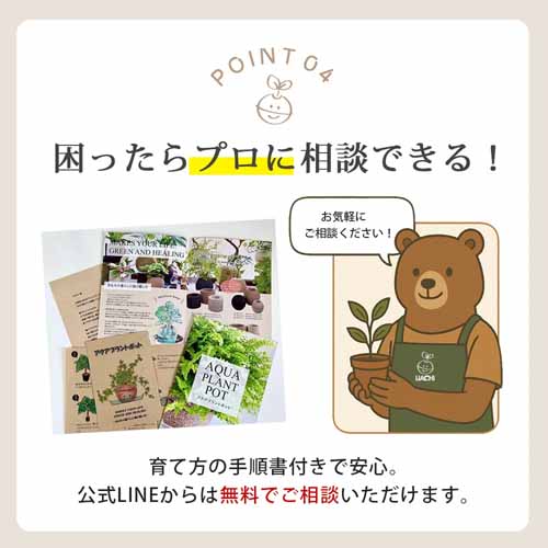 パキラ、ガジュマル、サンスベリアなど、定番人気の7種類から選ぶことができます。育て方の手順書付きで、困ったら公式LINEから無料で相談できて安心。
