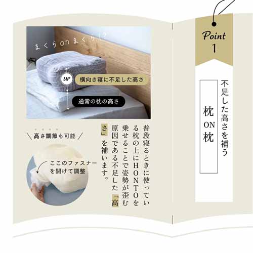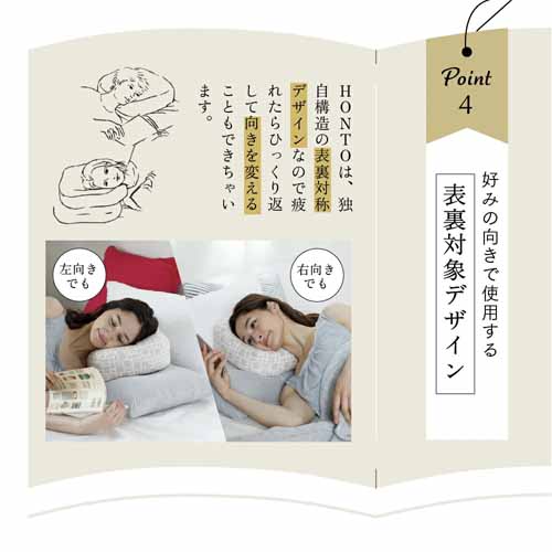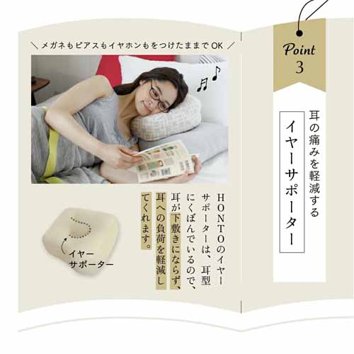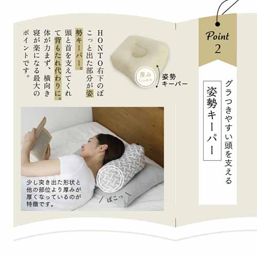 表裏対称デザインで、寝返りなど様々な読書姿勢に対応。横向き寝姿勢に求められる枕の高さを補いながら、姿勢キーパーでグラつきやすい頭をしっかりホールド。耳型にくぼんだイヤーサポーターで耳をやさしく保護して痛みも軽減してくれます。