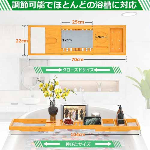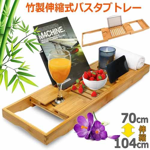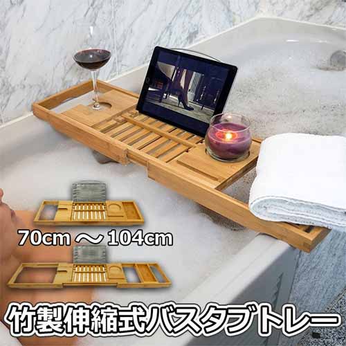 横幅70cm~104cmの伸縮式で、使わないときはコンパクトに収納できます。これさえあれば、長時間のバスタイムも一気に充実性が上がること間違いなし。