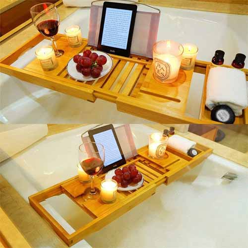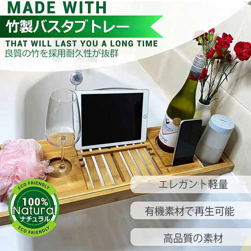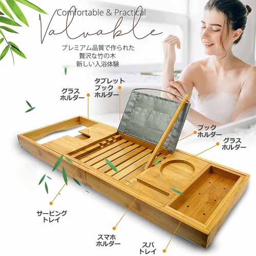 伸縮式で浴槽サイズに合わせて調整でき、竹製で安定感と耐久性がバツグン。ブックホルダーが付いていることが秀逸で、手放しで読書を楽しむことができます。他にもスマホホルダーやグラスホルダーなど機能的な収納スペースが充実し、読書だけでなく入浴時間全体の満足度を高めてくれます。