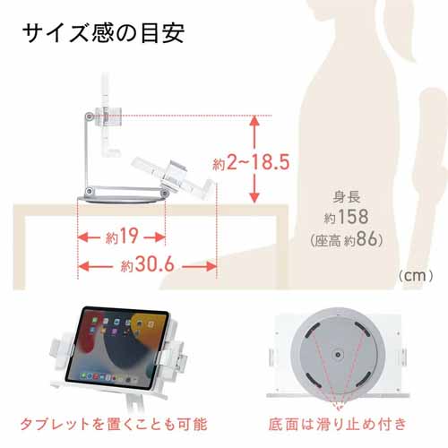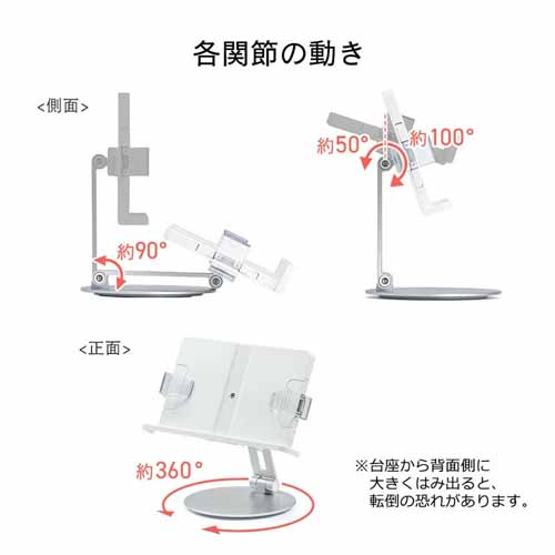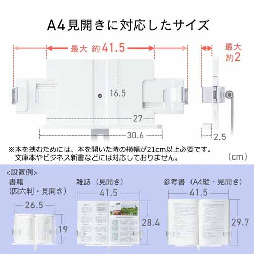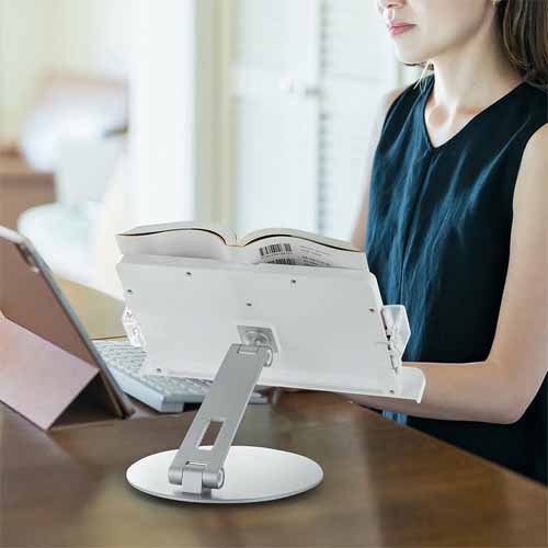 関節で角度調節ができるアーム付きなので、姿勢や視線の高さに合わせて最適なポジションを確保できます。ページを押さえるストッパー付きで、厚い本でもしっかり固定。台座が回転するため、簡単に見やすい向きに変えられ、A4見開きに対応しています。