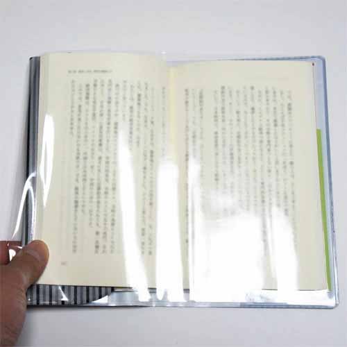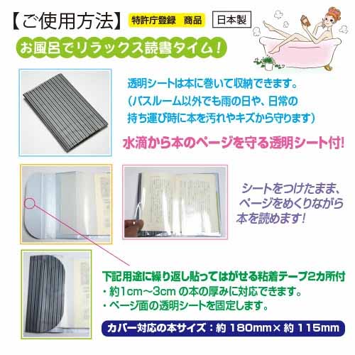 透明素材で中身が見やすく、シートをつけたままページめくりもできます。約1cm~3cmの本の厚みに対応できる粘着テープが2箇所に付いていて、本をしっかりホールド。お風呂でゆっくり半身浴しながら読書が楽しめます。