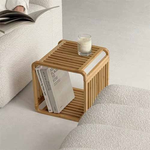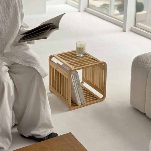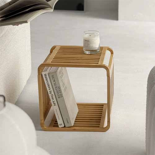 木目調デザインがナチュラルで温かく、北欧インテリアにも和モダンにも馴染むマルチユースなアイテム。角の丸い立方体のフォルムが愛らしい一品です。