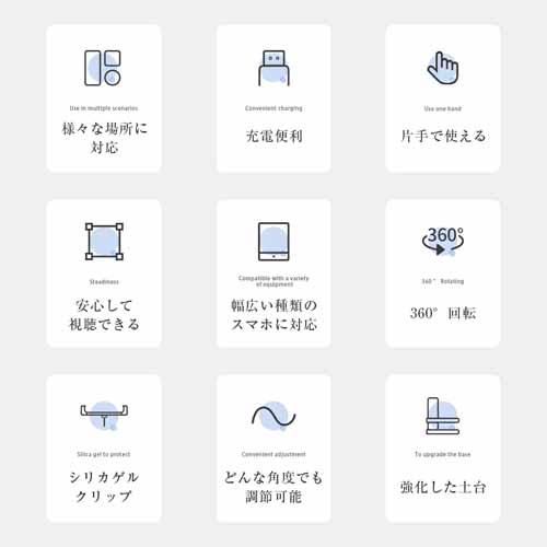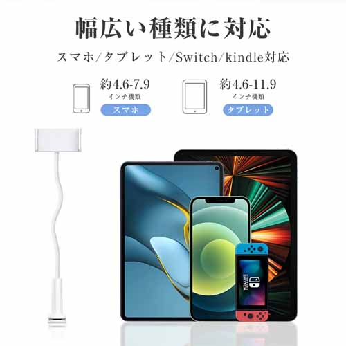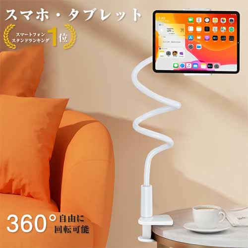 アームは360度調整可能で、ベッド・ソファ・デスクなどあらゆる場所で快適に使えます。しっかり固定できるクランプ式でぐらつきにくく、Kindle・スマホ・タブレットなど多デバイスに対応。充電口が開いているので、充電しながら操作ができて便利です。