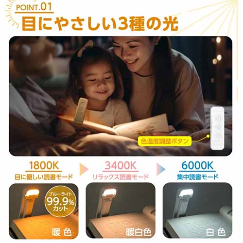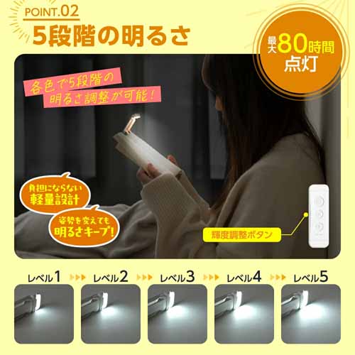 3種の色温度と5段階の明るさ調整で、紙の質や環境に合わせて最適な光に設定できます。USB充電式&コードレス使用、最大80時間点灯で外出先でもストレスなく使用可能。クリップ部分は滑りにくい仕様で、本を傷つけない設計。軽量で長時間使用しても疲れにくいのもポイントです。