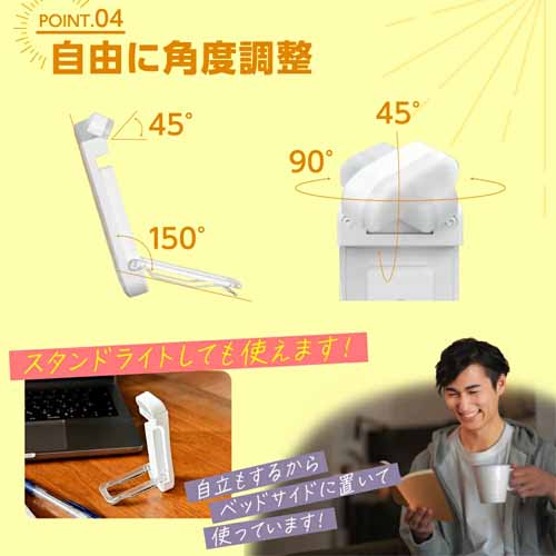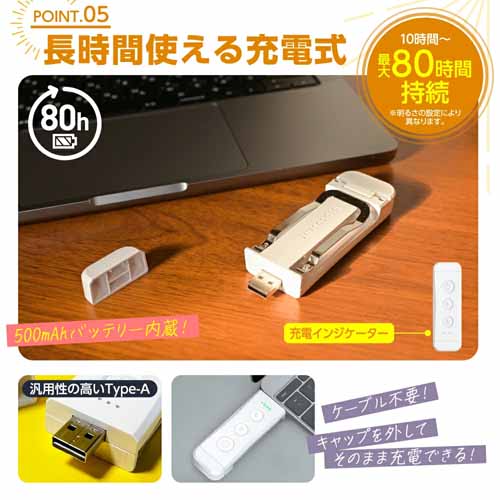 1回の充電で最大40時間使用可能な大容量バッテリーを搭載し、コードレスで持ち運び自由。2段階調光の電球色LEDが採用され、本体をひっくり返すだけでON/OFFが切り替わるユニークな設計です。タイマー機能付きなので就寝前にも使えます。