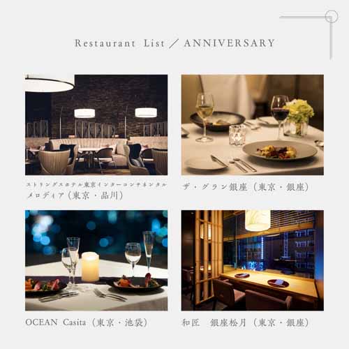 料理のおいしさはもちろん、落ち着いた雰囲気やサービスを含めて、特別な日に訪れたいレストランが厳選。フレンチ・イタリアン・日本料理など、都内近郊の約10店舗の中から受け取る方が自由に選べます。