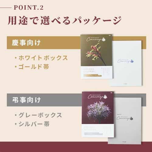 贈る前に中身がwebで見れるので安心感があります。慶事向けにホワイトボックス&ゴールド帯、弔事向けにグレーボックスにシルバー帯が用意されています。