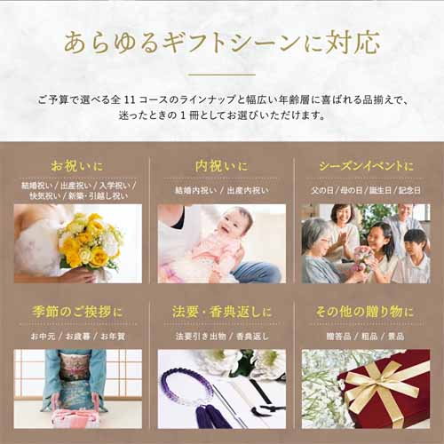 全国の名店グルメや老舗ブランドなど最大約2,290点の品揃えが充実。冊子の作りも上品で、贈答用として申し分ありません。コース展開が豊富で、シリーズ内で価格帯を揃えやすい点も魅力です。