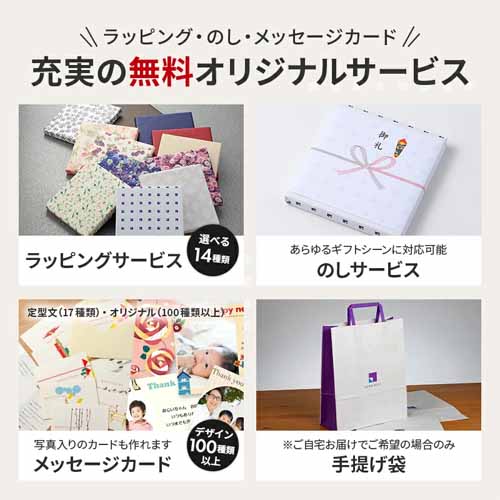ラッピング・メッセージカード・のし無料で、即日発送の対応もうれしいポイント。名入れスタイや名入れハンカチも追加オプションとして選択できます。