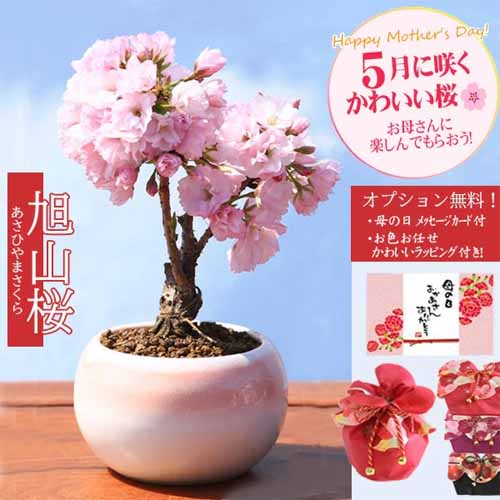 丸陶器鉢に植えられた「旭山桜」の盆栽。開花時には淡いピンクの花が咲き、季節の移ろいを感じられます。育て方の説明書が付いているので、初心者でも安心して育てることができます。和風ラッピングも可能なのでぜひ活用しましょう。