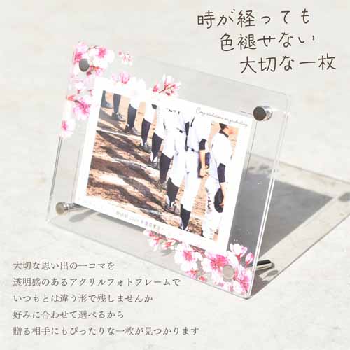 透明感のあるアクリル素材に桜デザインを施したフォトフレーム。データ入稿型でカスタマイズ可能。仕上がりイメージも送付してもらえるので完成をイメージできることも安心です。フリーメッセージで気持ちを鮮明に伝えられることもポイント。
