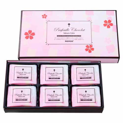 桜の花を加えたチェリーソースを、ストロベリーと桜の葉が香る薄いチョコレートでコーティング。繊細なくちどけと甘酸っぱさが重なり、奥行きのある味わいに。キューブ型の個包装でシェアしやすく、春らしいパッケージも魅力です。