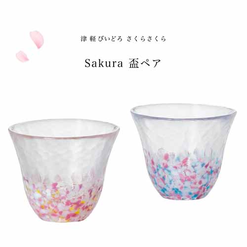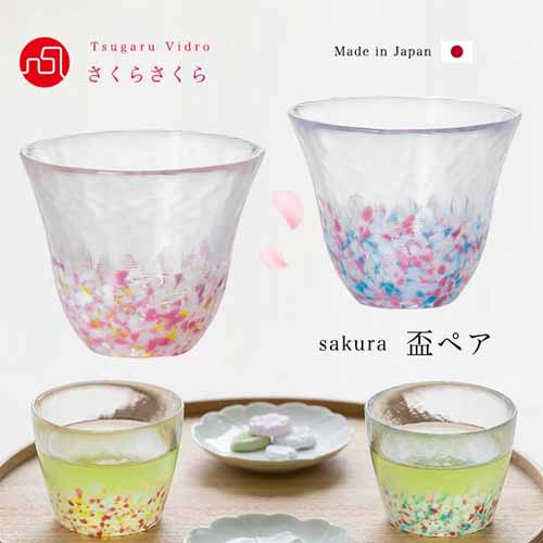 蕾から開花までを待ち遠しく思う気持ちを閉じ込め、ピンク色を中心に春らしい爽やかなガラスをちりばめたびいどろ。ハンドメイドならではの揺らぎと透明感が特徴です。桜柄が光に透け、冷酒をより美しく演出します。ペアセットで箱入り仕様なので、かしこまったプレゼントにも贈ることができます。