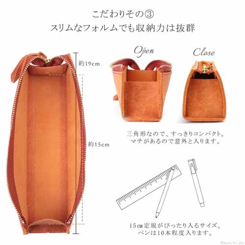 高級感のあるイタリアンレザーを使用し、日本製の丁寧な縫製で仕上げた一品。スリムながら収納力があり、ビジネスや通学バッグにもすっきり収まります。使うほどに革がなじみ、経年変化も楽しめる本格仕様です。