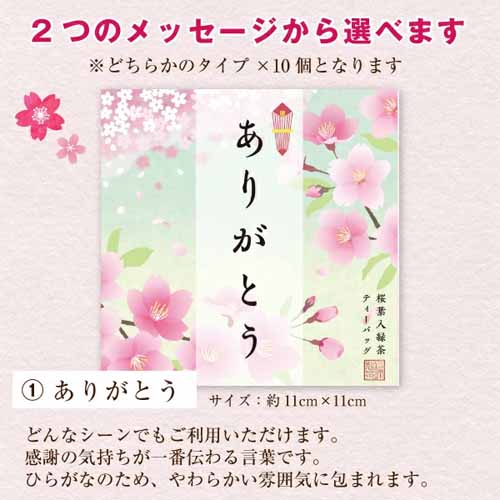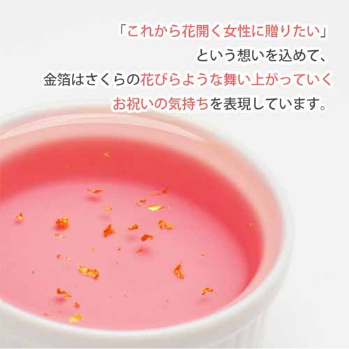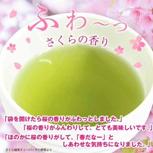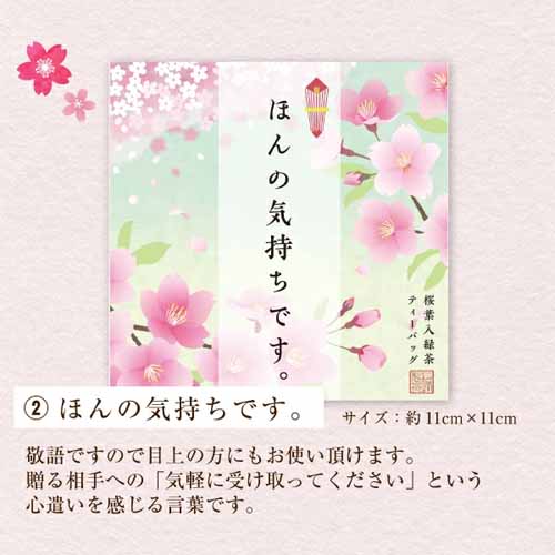 鹿児島産の「さつまの風」100%と国産のさくらの葉&花びらをブレンドしたフレーバーティー。透明感のある緑茶に桜の香りがふわりと乗った、上品な味わいです。2つのメッセージから選べるパッケージも可愛らしく、プチギフトとして渡しやすい仕様です。