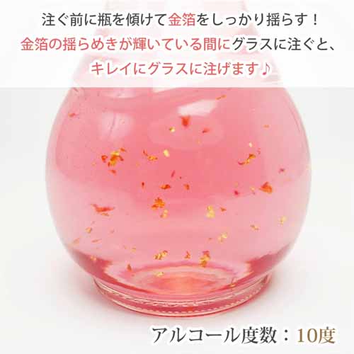 和歌山県産の南高梅を使った本格梅酒に、桜シロップの香りを重ねた華やかな味わい。アルコール度数は10度と比較的低めで、口当たりがやさしく飲みやすいのが特徴です。グラスに注ぐと金箔がふわりと舞い、見た目にも春らしい華やかさを演出。丸みのある可愛らしいボトルは、飲み終えたあと花瓶やインテリアとしても楽しめます。