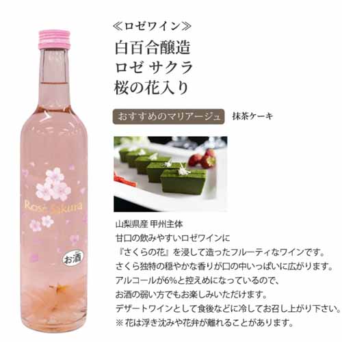 就職祝いや母の日に贈りたいのが、山梨の老舗ワイナリー「白百合醸造」が手がける桜ラベルのロゼワイン。甘口で飲みやすく、桜の花が浸してある趣のある見た目で、お酒初心者の女性にも喜ばれます。