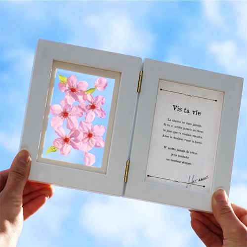 思い出の写真を桜で飾るプレゼント。大切な思い出を色褪せさせず、卒業や退職など別れのシーンに華を添えます。