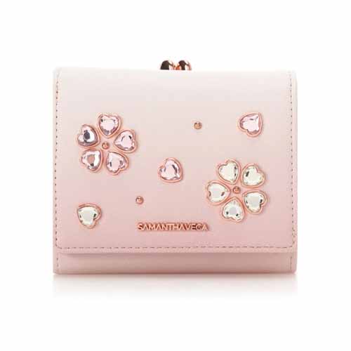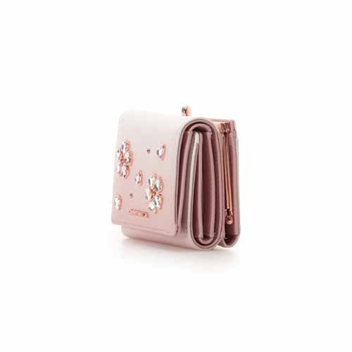 ビジューで桜を表現した華やかな3つ折り財布。コンパクトなのでミニバッグを愛用する彼女や女性におすすめです。カードポケットやお札部分の仕分け付きで必要なものを整理でき、使いやすさにも配慮されています。デザイン性と実用性を合わせ持つ一品です。
