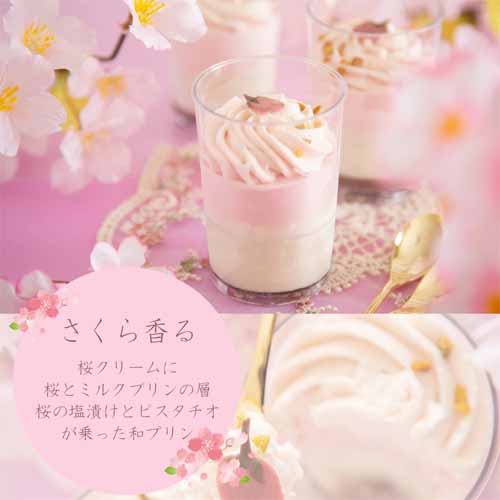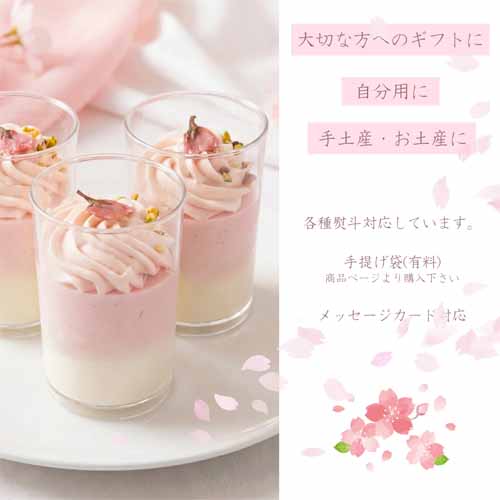 なめらかな桜とミルクプリンに桜風味のクリームを重ね、ピスタチオと桜の塩漬けをあしらった一品。やさしい甘さとほのかな塩味が絶妙に調和しています。淡いピンク色が春らしく、ガラス容器の上品さも魅力。専用のボックスに入り、2個入りから6個入りまで選べる柔軟性も助かります。