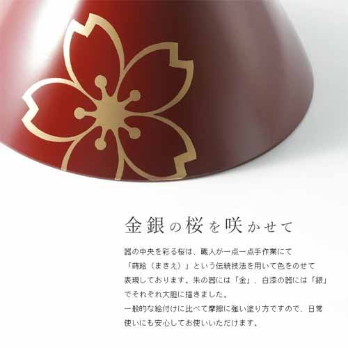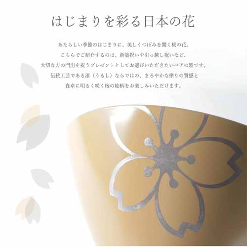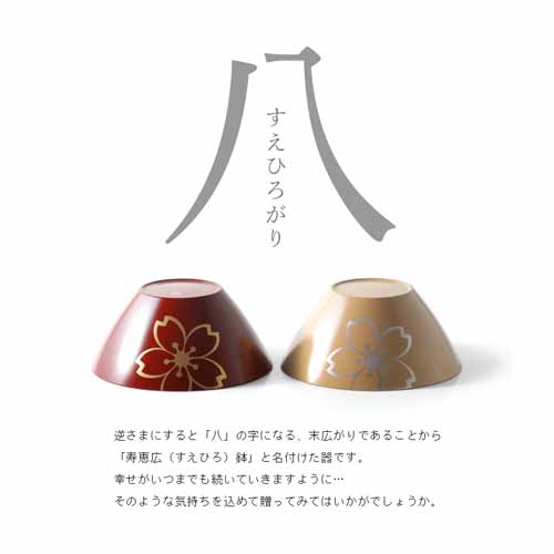 漆塗りならではの艶と軽さをもつ鉢。睦桜の意匠が控えめに施され、和洋問わず使えるデザインです。未来が広がり縁起が良いとされる“末広がり”の形もハレの日にふさわしいゆえん。ペア仕様で長く愛用していただけます。