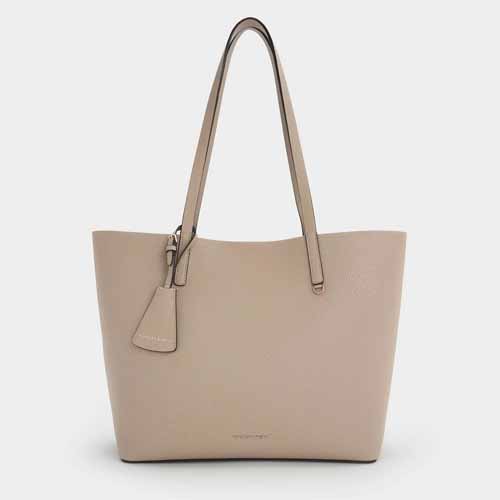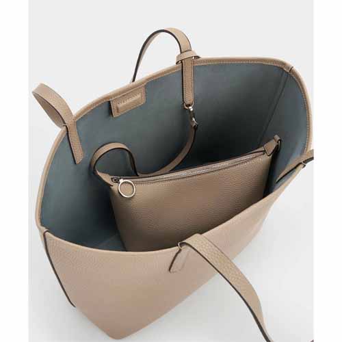 シボ感のある美しいレザー調のフォルムと大容量の収納力が魅力のトートバッグ。金具やパーツなどを限りなく省いた洗練されたデザインでありながら、A4ファイルやペットボトル、折りたたみ傘も無理なく入って便利です。