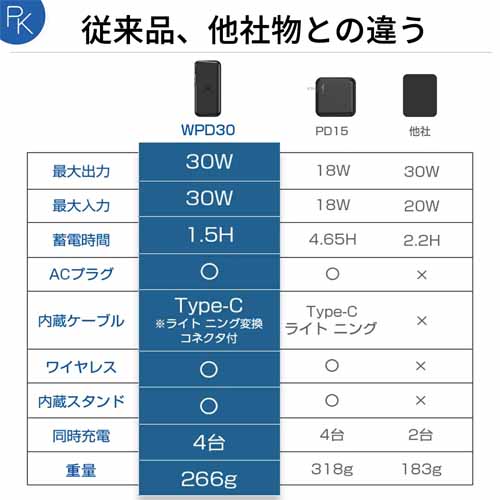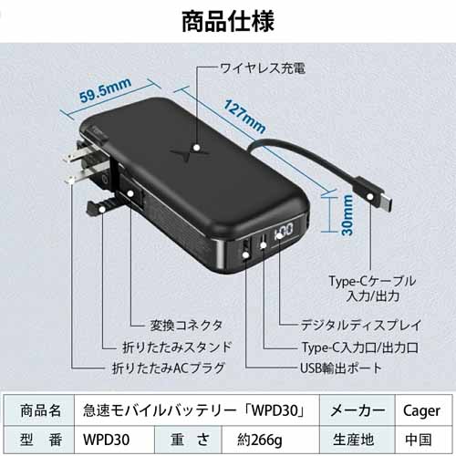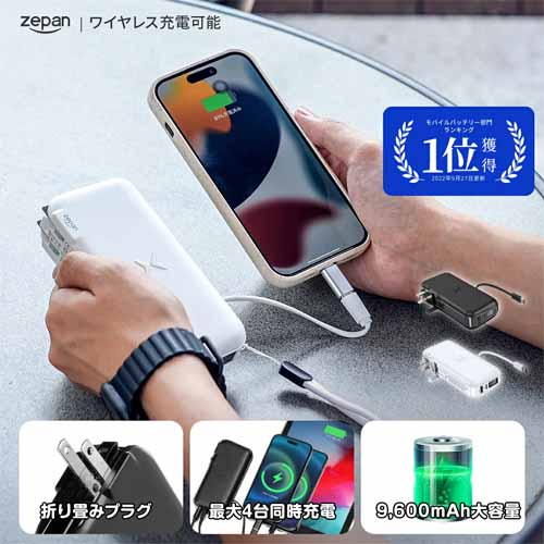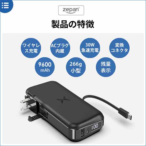 コンセントプラグにType-Aポート・Type-Cポート・Type-Cケーブル(Lightning変換コネクタ搭載)が一体になった充電器。モバイルバッテリーにもなっていて、出先でのスマートフォンの急な電池切れにも安心です。本体の充電方法もType-C急速充電とAC電源充電から選べて便利。