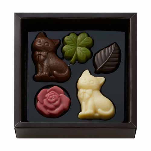 猫・バラ・クローバー形のチョコは口どけなめらかでやさしい甘さ。蝶ネクタイ姿の子猫が描かれた箱も上品。少量でも満足感があり、個別配布に最適です。1箱に5粒と負担のないボリューム感も配りやすさを感じます。