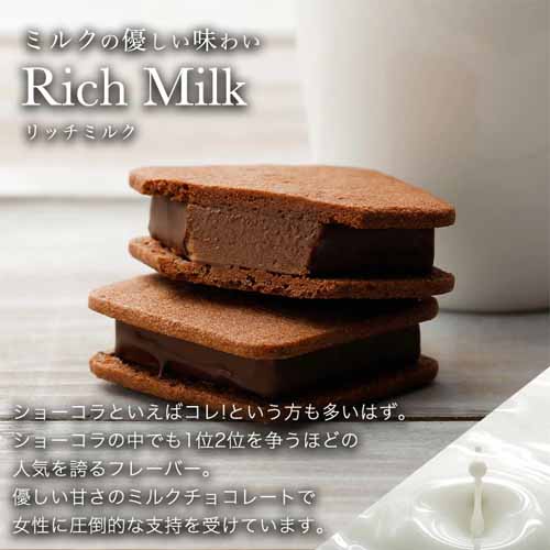 サクサクのバタークッキーで、濃厚な生チョコレートをサンド。中の生チョコはコーティングされ、パリッとした食感も楽しめます。カカオ55%とミルクの2種入りで、食感・味わいともに満足度の高い仕上がりです。