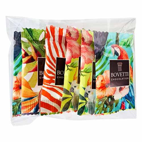 オウムと南国の花のイラストがパッショナブル。包装からもパワーを貰えそうな、おしゃれなばらまきチョコです。