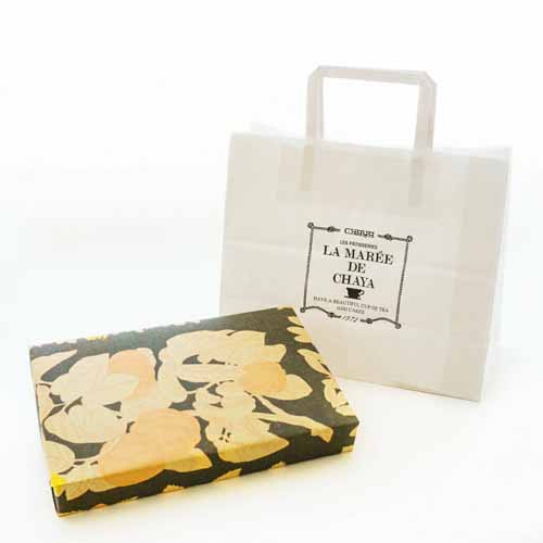 オレンジ香る濃厚ショコラと、アールグレイが香るミルクティー味の2種。ヨーロッパの街並ある板瓦(=カロ)を思わせる可愛らしい形と、レトロな草花柄ボックスが上品な印象を与えます。