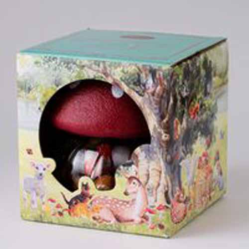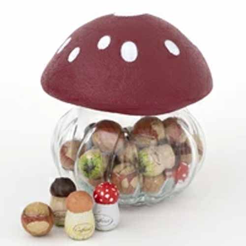 おとぎ話に出てきそうなきのこ型ポットの中には、ジャンドゥーヤクリーム入りのミルクチョコが18粒と、ヘーゼルナッツを丸ごとミルクチョコレートで包んだものが9粒入っています。ヘーゼルナッツのコクとやさしい甘さが広がり、見た目だけでなく味わいも本格派です。