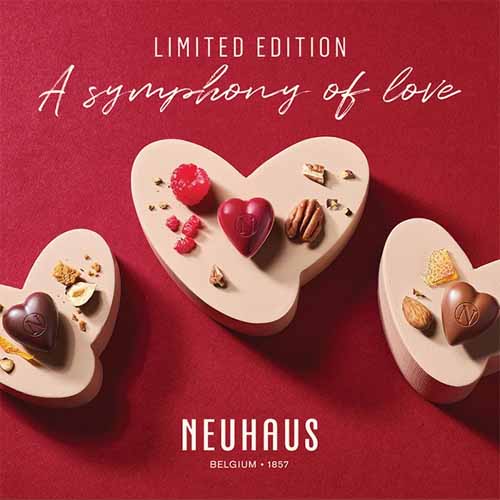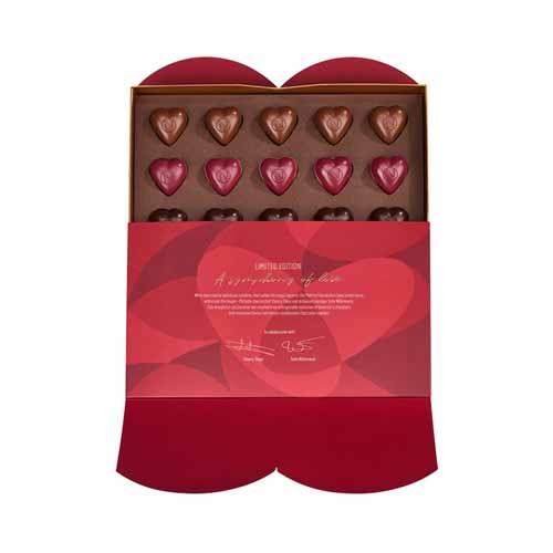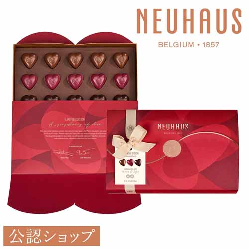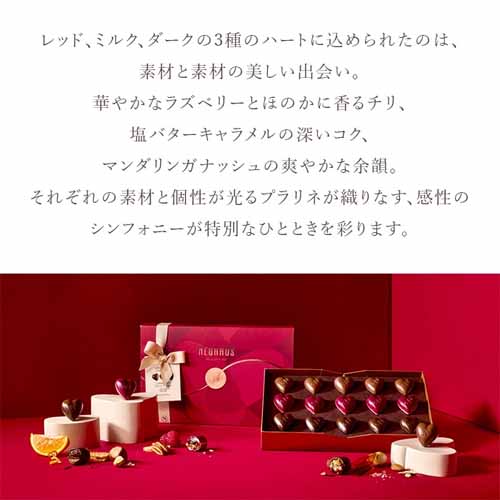 1857年創業、ベルギーチョコレートの元祖ともいえる老舗「ノイハウス」の限定ボックスは、配るだけでセンスと知識が伝わる存在。ハート型のショコラと情熱的な赤いボックスが印象的で、バレンタインや女子会など特別感を演出したい場に最適です。