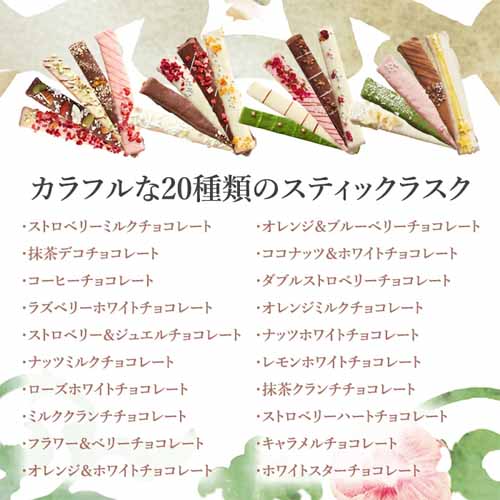 20本すべて1本ずつ異なるデザインで、“選ぶ楽しみ”まで贈ることができます。デザインと味で場を盛り上げるチョコラスクです。